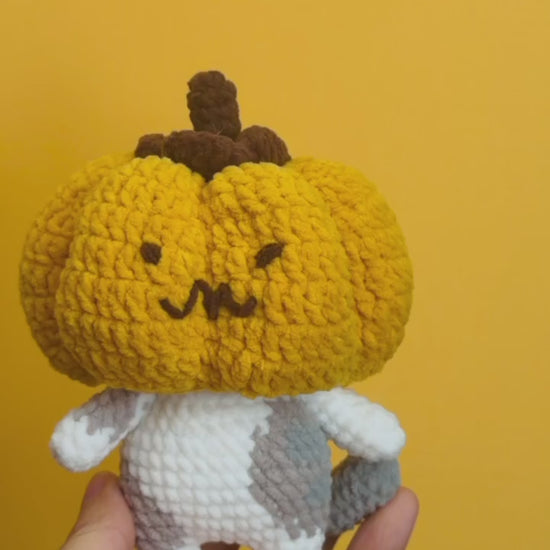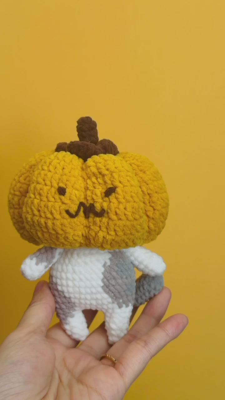 This handmade kitty is dressed up for the season, wearing a soft, plush pumpkin hat that captures all the cozy Halloween vibes.